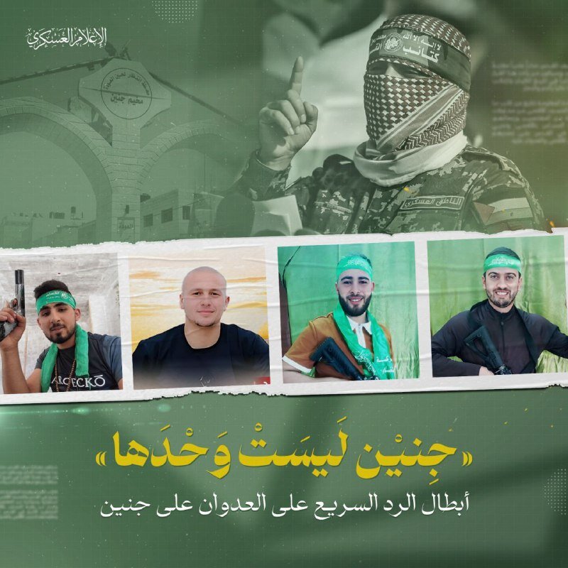 به گزارش مخبران، ابوعبیده شامگاه روز پنجشنبه در پیامی تلگرامی نوشت: وقتی گردان های قسام اعلام می کند که جنین تنها نیست، خوب می داند که چه می گوید و عملیات شهید مهند شحاده و شهید خالد صباح دو مبارز قسامی در شهرک عیلی، بهایی بود که دشمن اشغالگر باید به خاطر تجاوز ماه گذشته به جنین پرداخت می کرد.
