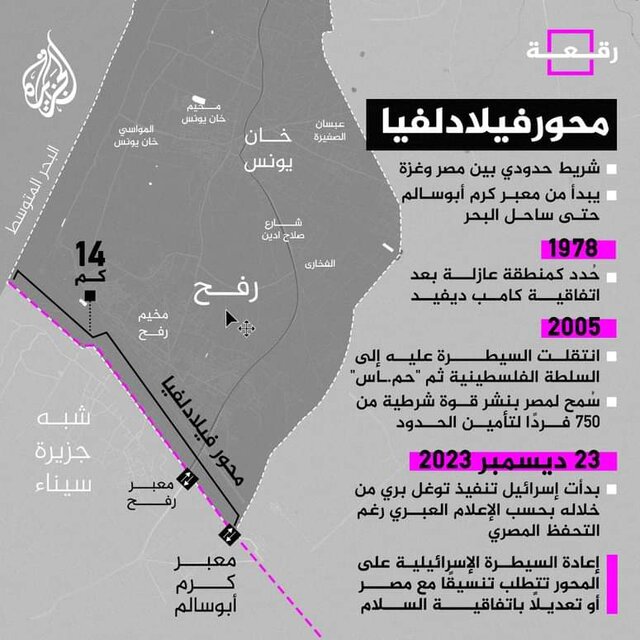 طبق نوشته روزنامه العربی الجدید، سرنوشت منطقه مرزی مصر و نوار غزه یا به اصطلاح محور «فیلادلفیا» در چند روز گذشته به ویژه با توجه به تحرکات نیروهای رژیم اشغالگر در مناطق مرزی شرق رفح در جنوب نوار غزه محور بحث های رسانه ای بوده است و اخباری مبنی بر تمایل رژیم صهیونیستی برای اشغال این محور و ایجاد یک مانع زمینی ضدتونل در امتداد مرز بین غزه و صحرای سینا مخابره شد.