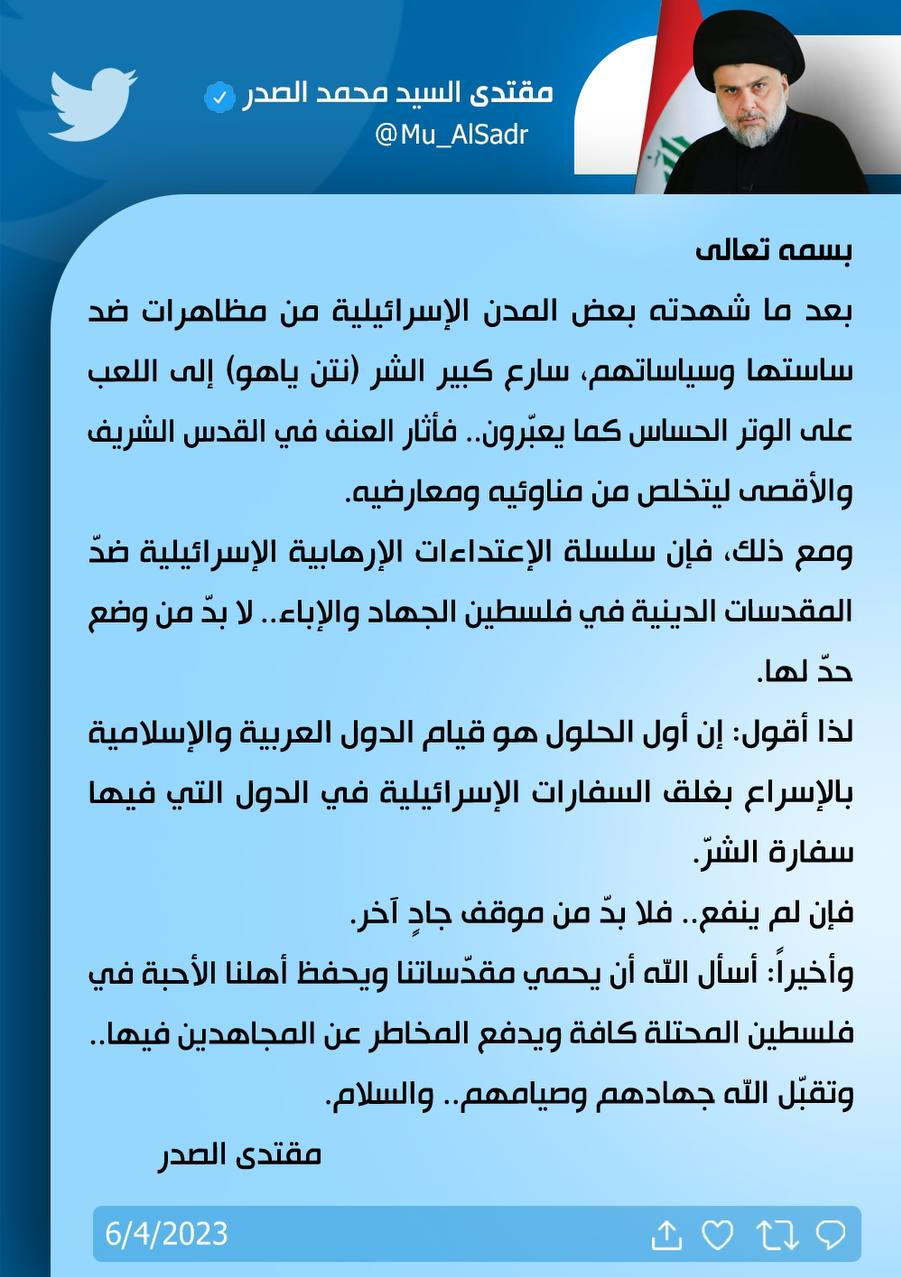 به گزارش گروه بین الملل خبرگزاری آنلاین مخبران، سید مقتدی صدر رهبر جریان صدر عراق در واکنش به حملات راکتی از جنوب لبنان به شهرکهای صهیونیستی واقع در شمال فلسطین اشغالی، خواستار بستن سفارتهای صهیونیستی در کشورهای عربی شد.